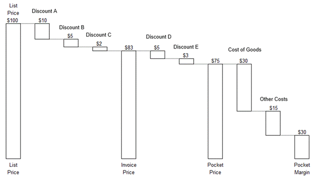 The example waterfall in the image starts with a $100 list price. The customer then receives a series of discounts to arrive at an invoice price of $83. These discounts might be for volume discounts, exception pricing to match a competitor, or one of many other discounts. The customer also receives other off-invoice discounts to arrive at a pocket price of $75. Off-invoice discounts include cash discounts or an annual volume bonus to the customer. The pocket price is reduced by the cost of goods and other costs to arrive at the pocket margin. Other costs might include servicing costs, sales costs, or shipping costs.