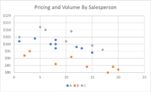 A key component of pricing and profitability, especially for B2B businesses, is discounting to individual customers. A company can graph the prices paid by customers for a product by volume and by salesperson. A sample graph might look like the graph below. The y-axis of the graph is the price paid per unit. The x-axis is the number of units purchased by each customer in an order.