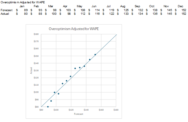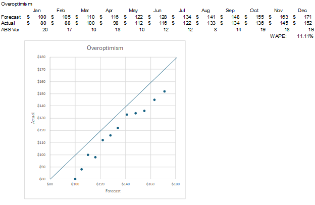 Below is a graph of an overoptimist. I’ve calculated the WAPE for their forecasts. However, I’ve weighted the WAPE by the forecast amounts, not the actuals. In other words, the WAPE is the sum of the monthly absolute variances divided by the total of the forecast amounts. I’m given forecast amounts, not actual amounts, so I want to calculate a number to adjust the forecast amounts. The WAPE is 11%.