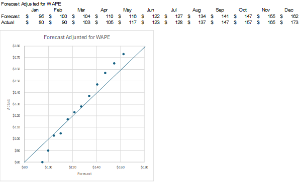 I can then adjust the forecasted amounts by the WAPE. Each forecast amount was multiplied by (1-WAPE). For example, the calculation for January is $100*(1-.11)=$89. The forecasts are now much closer to the actual amounts. Remember, forecasts equal the actual amounts along the upward-sloping line.
