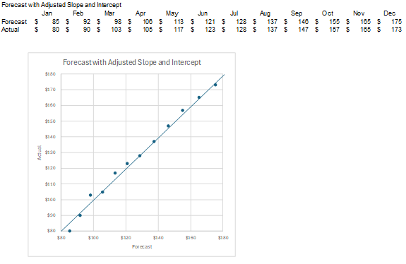 The dots are now closer to the upward-sloping line, but their slope is still wrong. In the graph below, I’ve adjusted each forecast amount by the line trendline formula. The updated forecast amount is: Original Forecast * Slope – Intercept. January’s updated forecast is calculated as: $100*1.27-41.74 = $85. Below is the full set of updated forecast amounts.