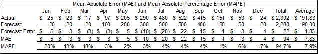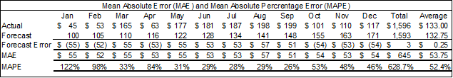 The total and average forecast errors are still $3 and $.25 in the updated table. However, the MAE is now $53.75, and the MAPE is 52.4%. The absolute value function of the MAE and MAPE formulas is absolutely valuable for capturing the volatility of the forecast errors (yes, that was a terrible math joke).