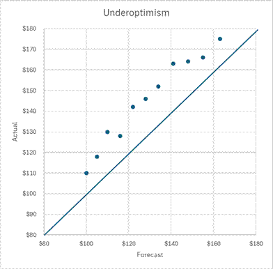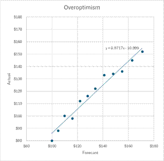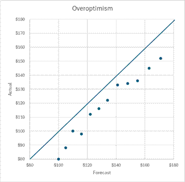 I’ll discuss common sources of forecast error in a later lesson. One of them is overoptimism. In overoptimistic forecasts, the forecasted amounts are always more than the actual amounts. The graph below shows dots consistently falling to the right of the line where forecast equals actual amounts.