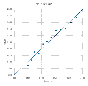 One way to detect patterns of bias is by graphing multiple forecasts against the actual results. The X-axis of the scatterplot graph below is the forecasted amount. The Y-axis is the actual amount. If we were clairvoyant, our forecast amounts would equal the actual amounts and would fall on the upward-sloping line. I won’t speak for you and your company, but my coworkers and I have not been so accurate or lucky. The best we can hope for is a graph where dots lie slightly above and below the line, like the one below.