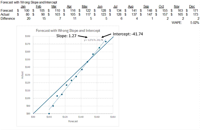 The slope is 1.27. The intercept is -41.74. These two numbers will be important later. Can I just adjust this forecast by the WAPE weighted on forecast amounts? I’ve calculated the WAPE to be 5%. Below are the forecast amounts adjusted by the WAPE.